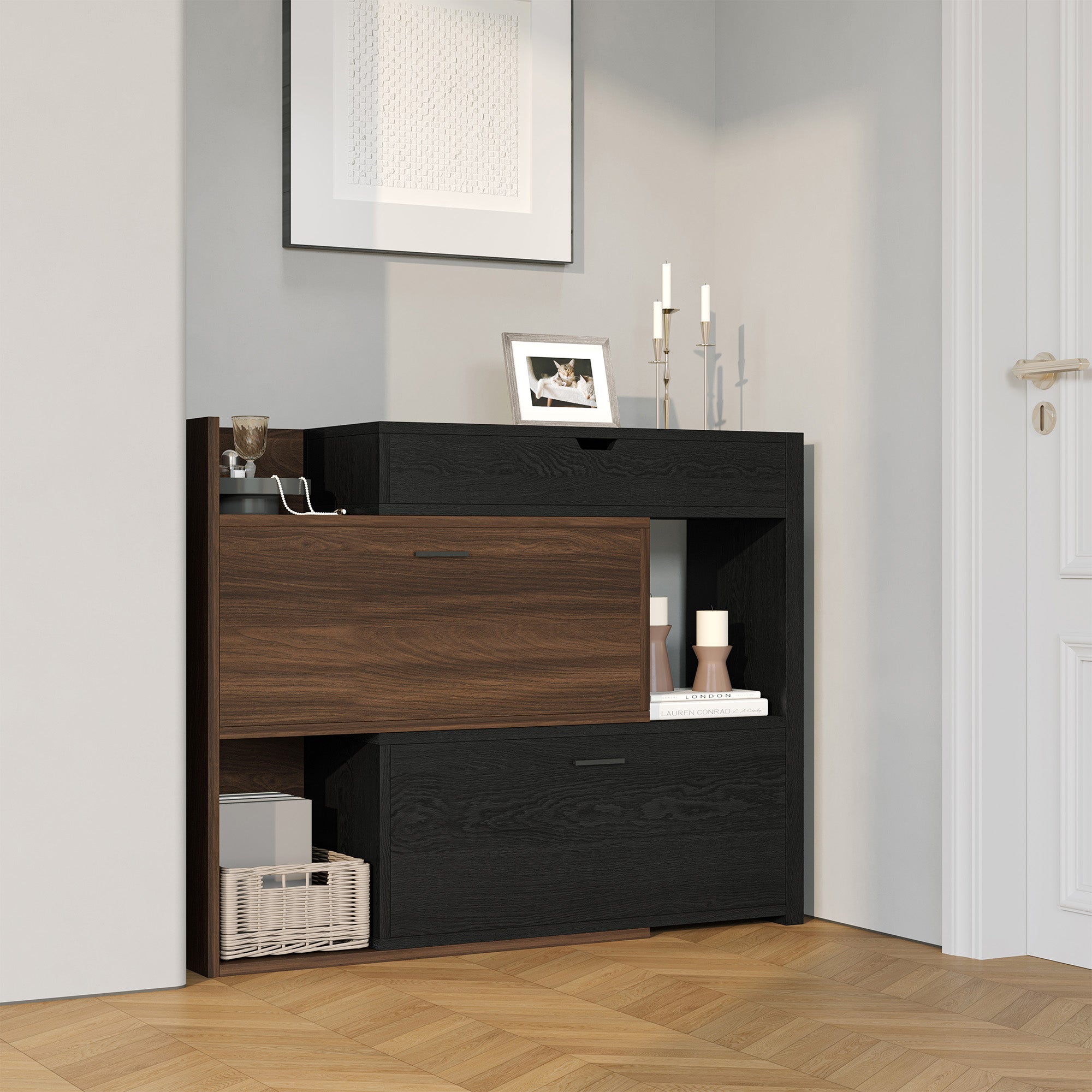 拡張可能なシューズキャビネットは、様々なスペースに合わせてカスタマイズ可能なデザインで、すっきりと整頓された玄関を実現します。コンパクトなサイズながらも、複数の収納スペースを備え、様々な靴や日用品をすっきりと収納できる大容量の収納スペースを提供します。頑丈な構造で耐久性と転倒防止を実現し、上品な木目調仕上げはモダンなインテリアに美しく調和します。小さなアパートにも広々とした住宅にも最適なこのキャビネットは、多目的な収納スペースとすっきりとした玄関を実現します。